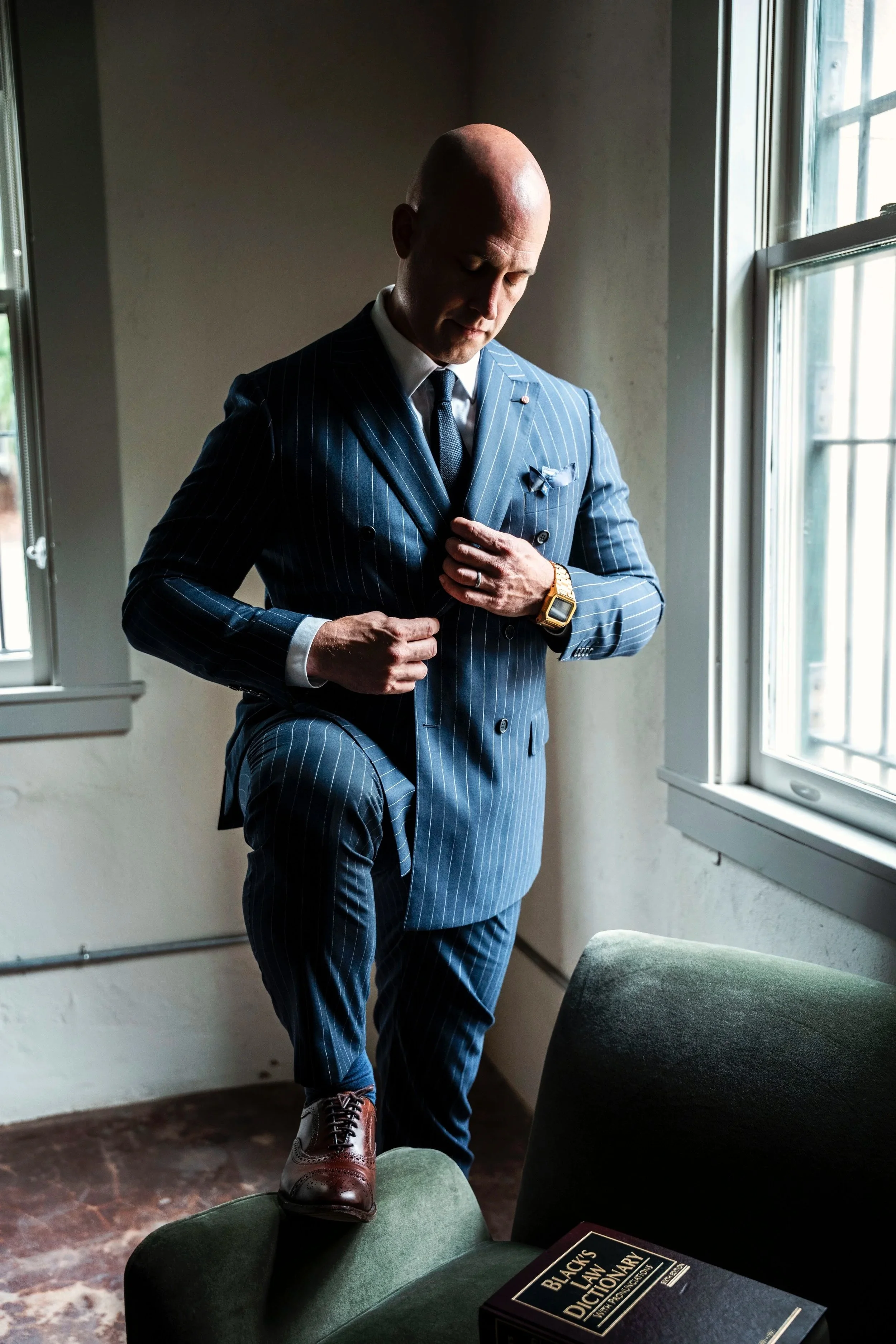 Boardroom: Navy pinstripe, white shirt, restrained tie. Presence without excess.